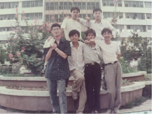 一九九三年,室友合影,从左至右,前排:罗小鸥、曹申、易啸、文锋,后排:邓斌、刘志祥