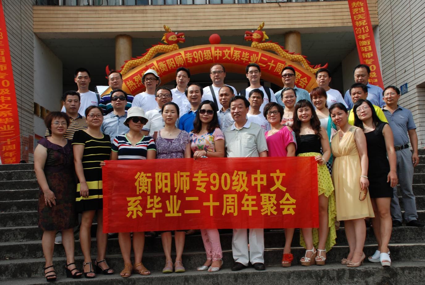 毕业二十周年,班上男生校内留影