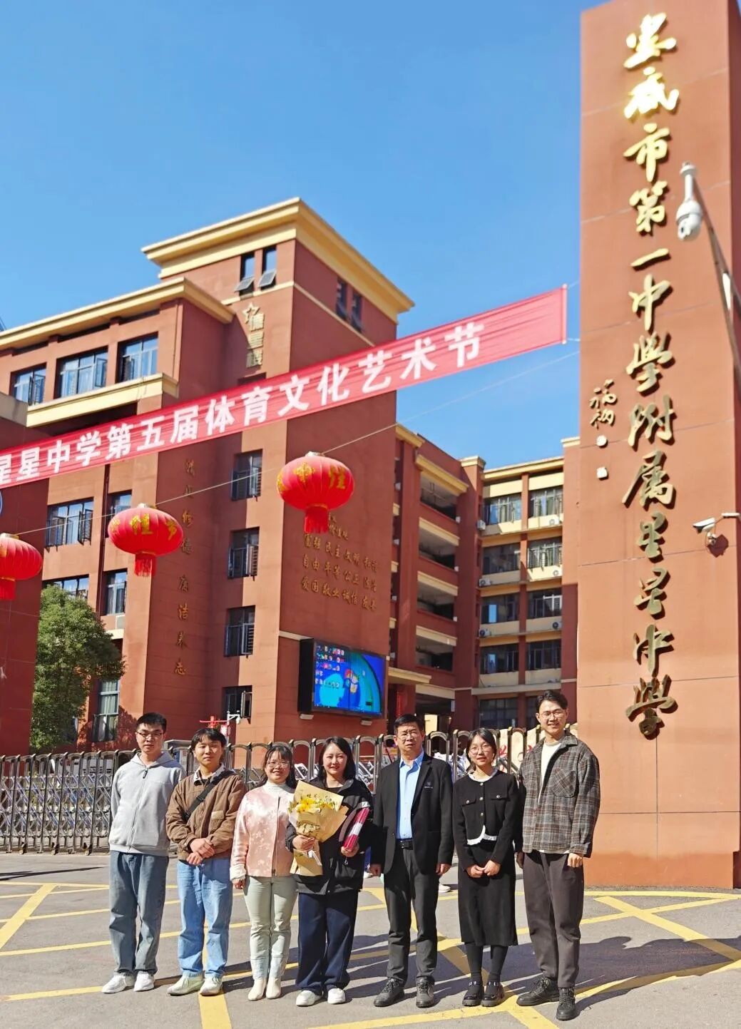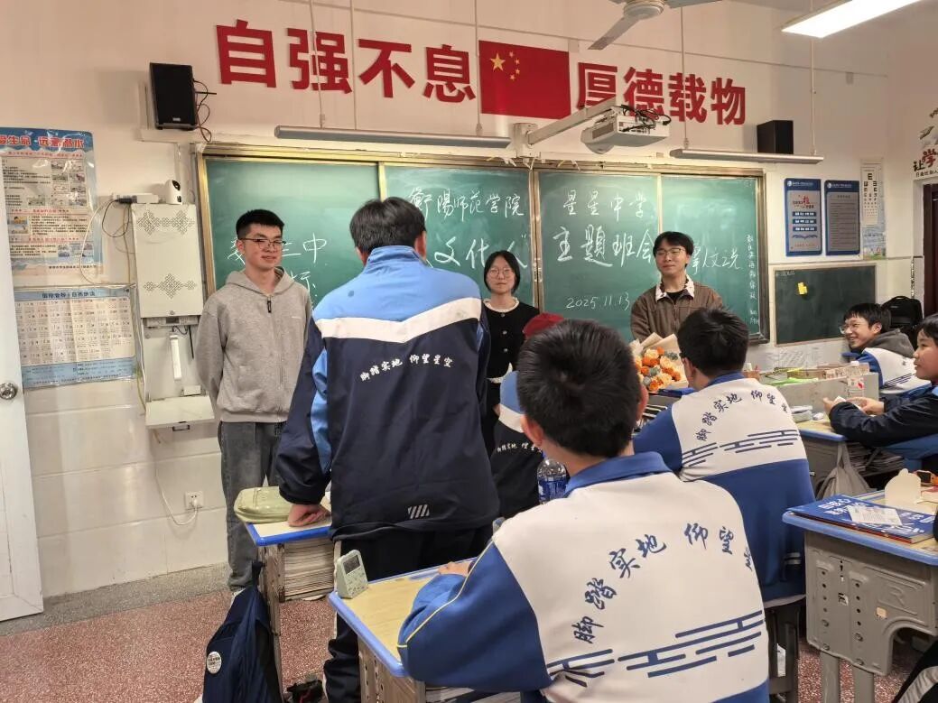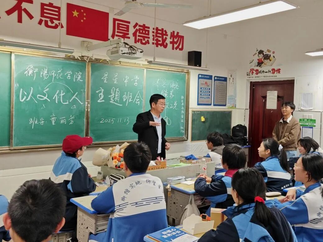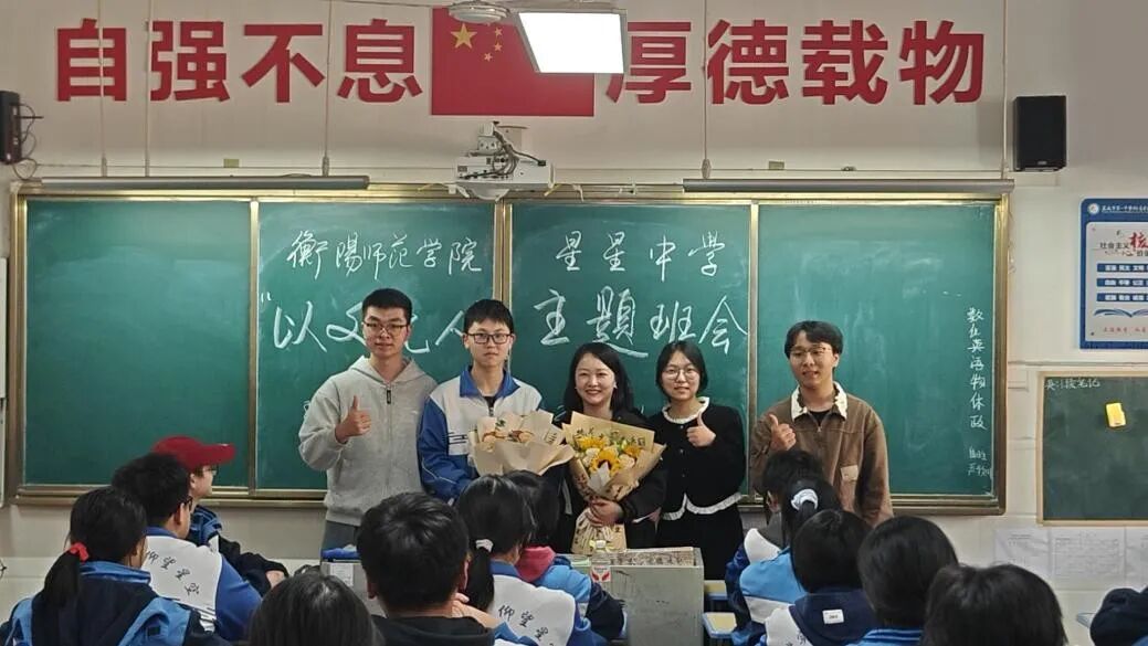 会后,文学院师生与星星中学班级联合开展“以文化人”主题班会。班会伊始,童丽芳分享了从衡阳师范学院习得“感知爱、表达爱、传递爱”的教育理念,提及这份能力助其收获教育成果的经历,并鼓励学生以文字传递真心。文学院的同学们手持鲜花上台,既向深耕基层教育的童老师致敬,也向学生代表龙睿熙传递了大学生朋友的关怀与期许。